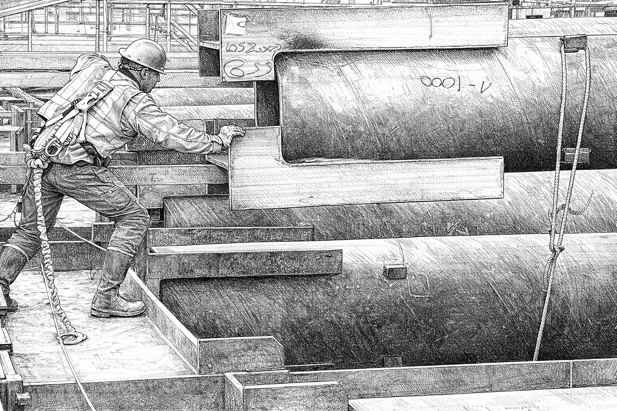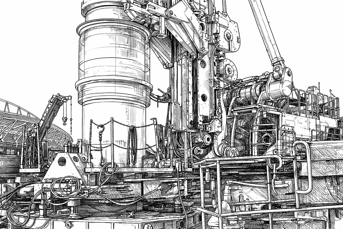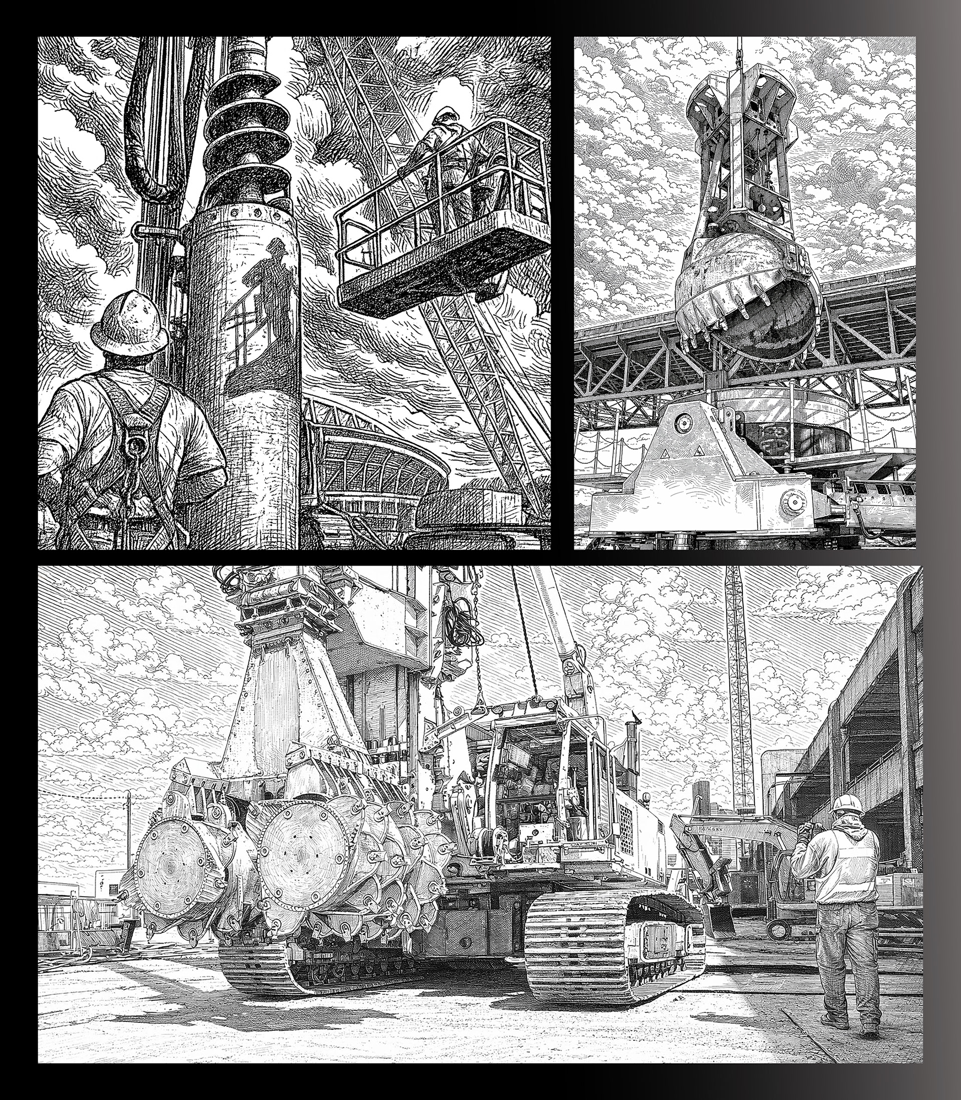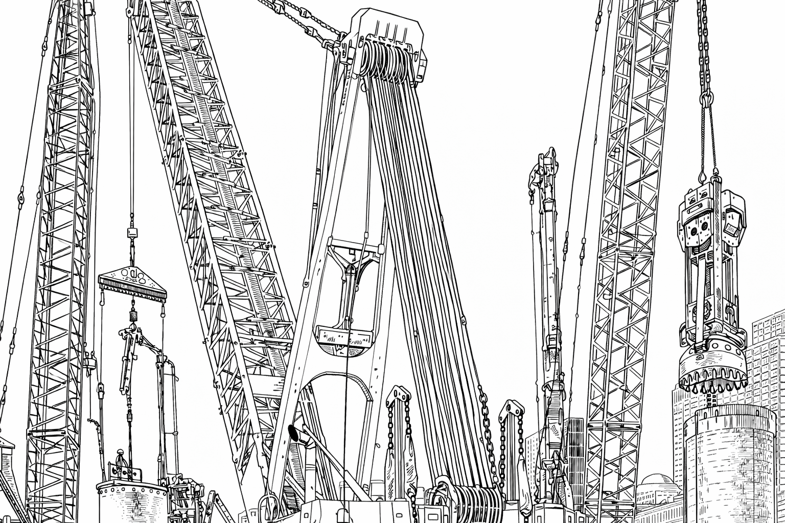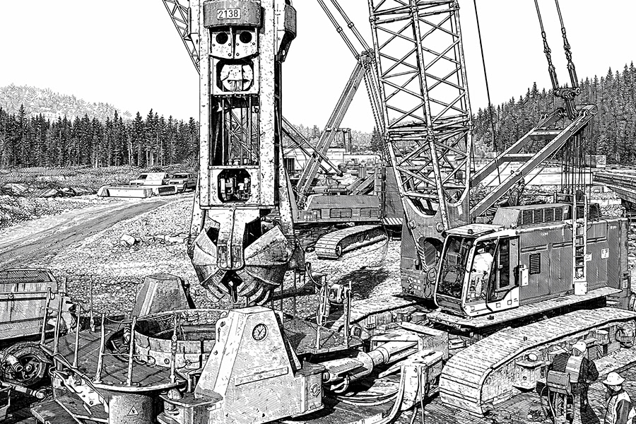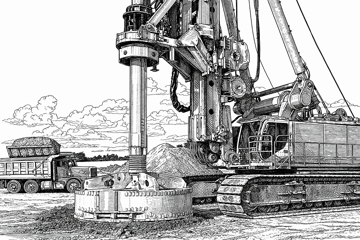 Real crews photographed on real job sites — powerline crews, ironworkers, heavy equipment, deep foundation drillers, welders, crane operators, carpenters, and more — then convert those images into crisp, high‑contrast line art that preserves every stroke, weld spatter, and weathered glove.