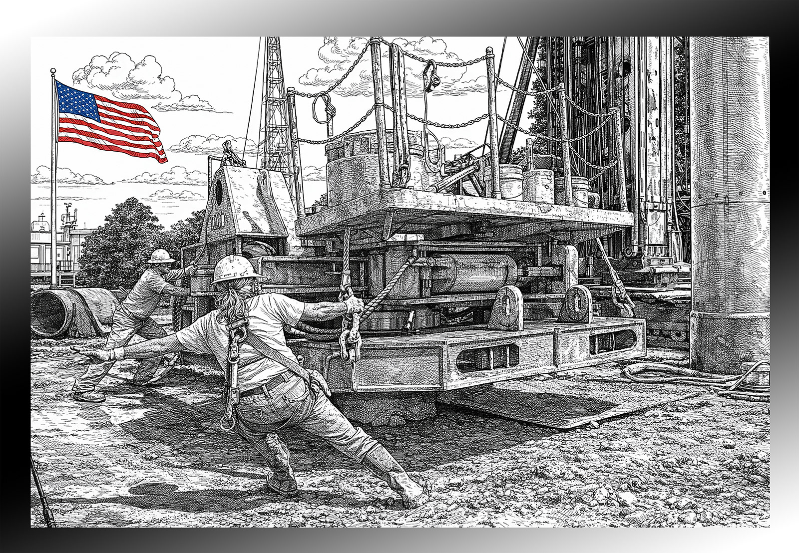 Real crews photographed on real job sites — powerline crews, ironworkers, heavy equipment, deep foundation drillers, welders, crane operators, carpenters, and more — then convert those images into crisp, high‑contrast line art that preserves every stroke, weld spatter, and weathered glove. The result is artwork that celebrates labor, craft, and community without posing or stock clichés. Available as archival prints, framed pieces, and downloadable files for apparel and reproduction.
