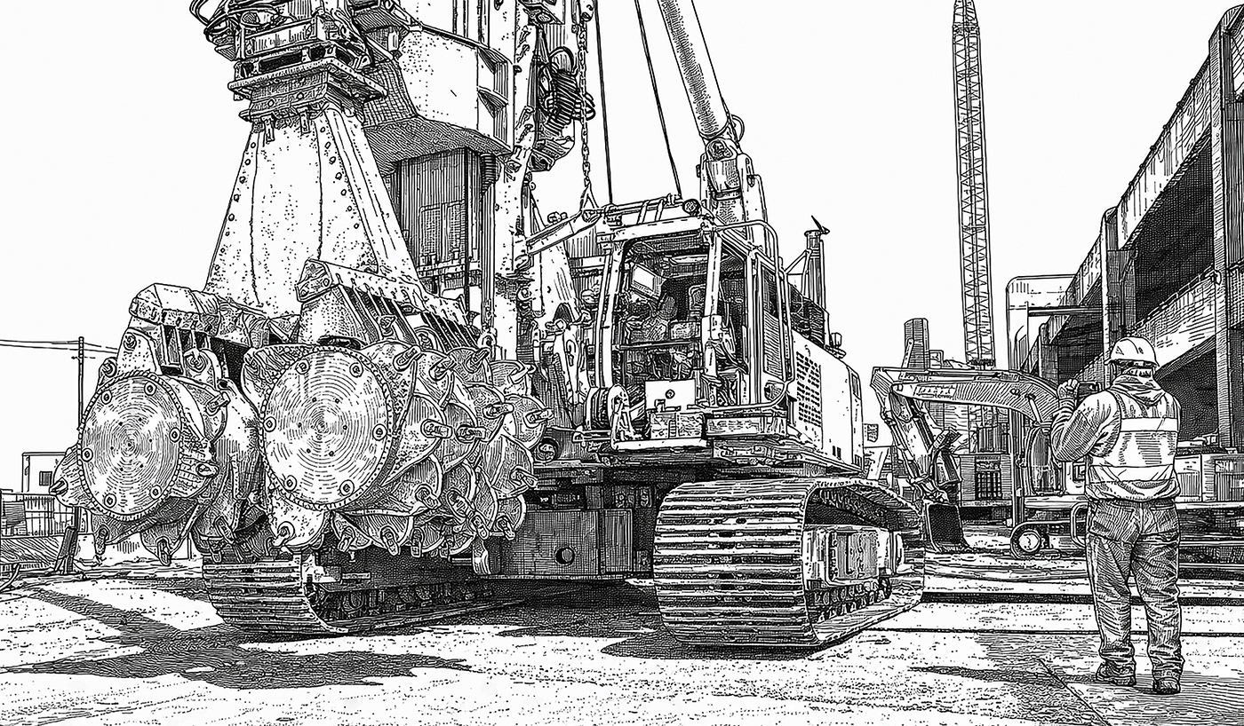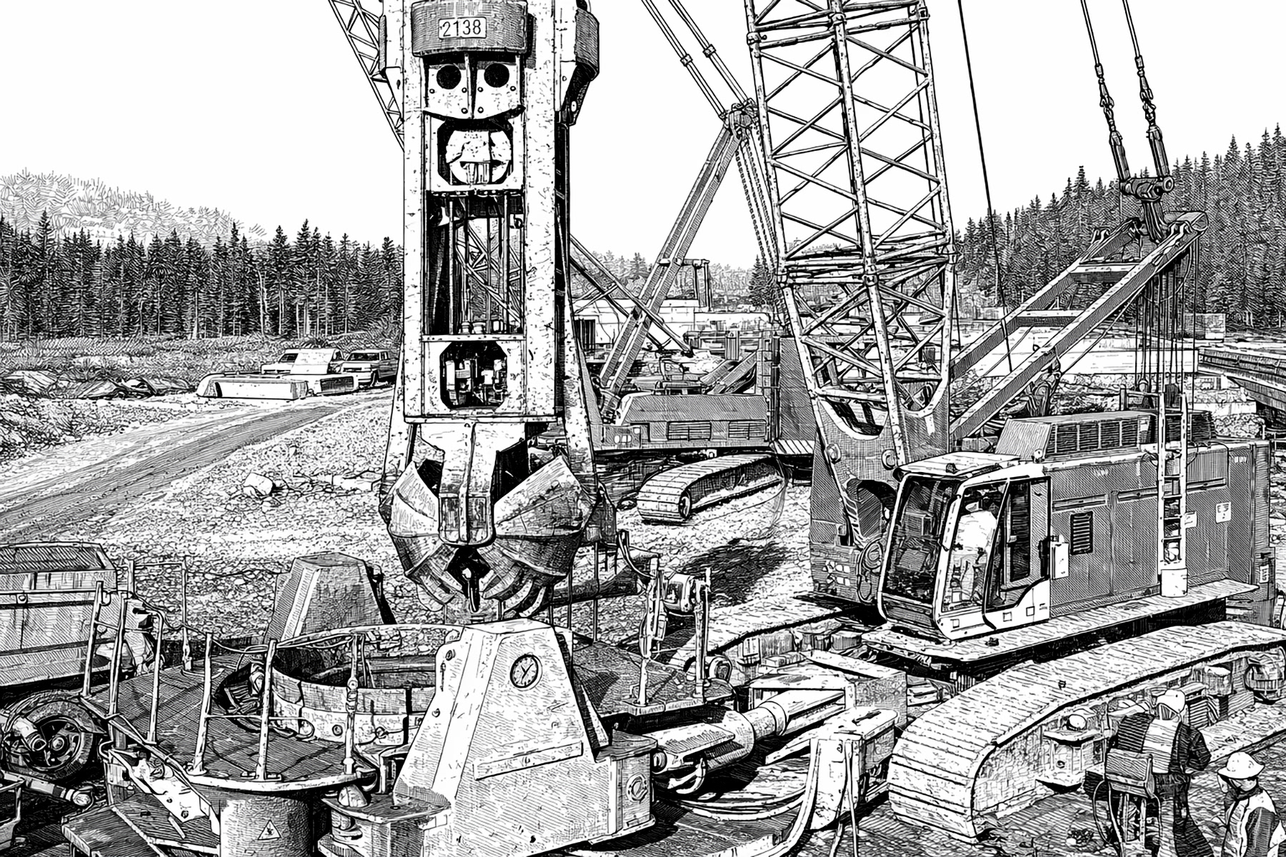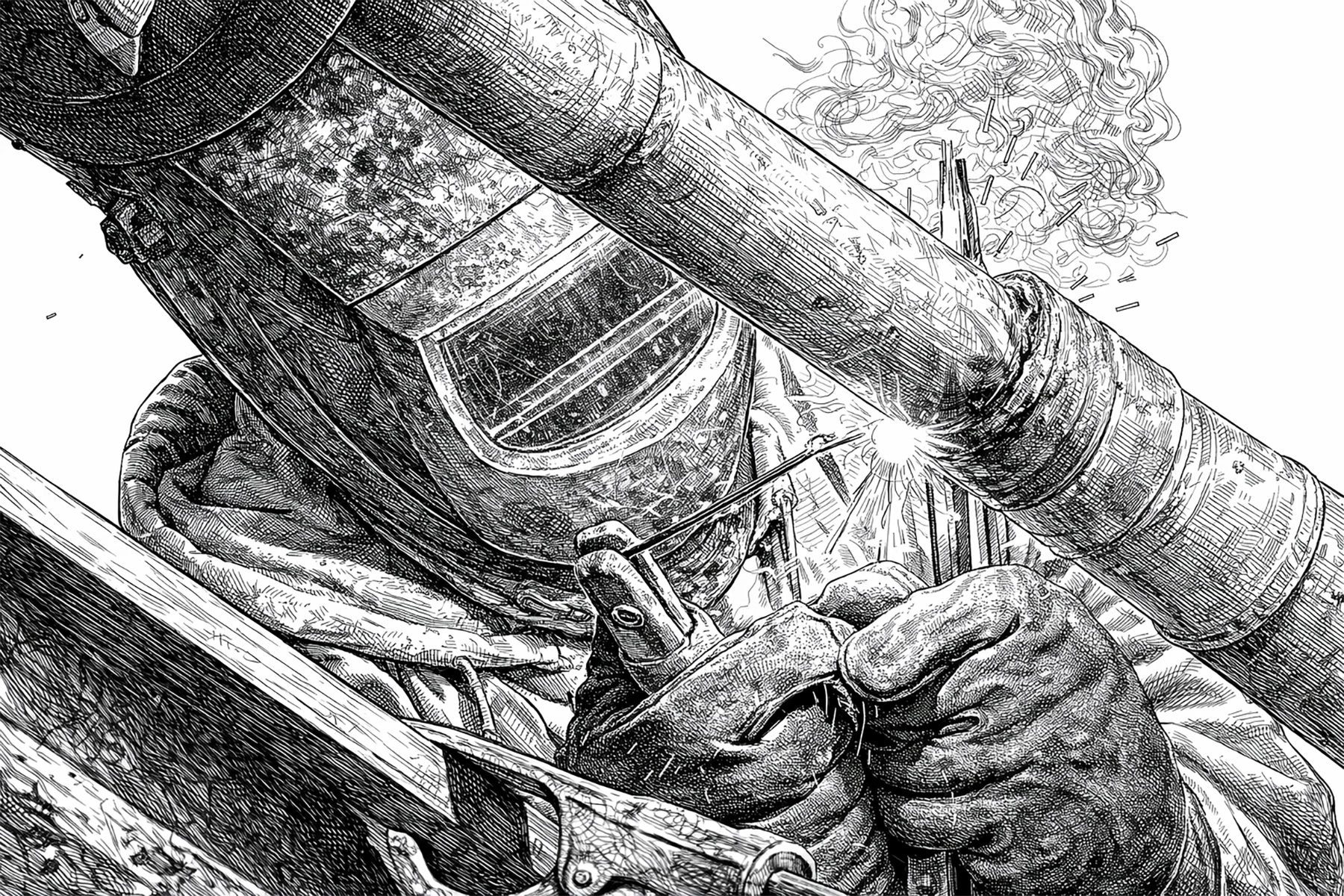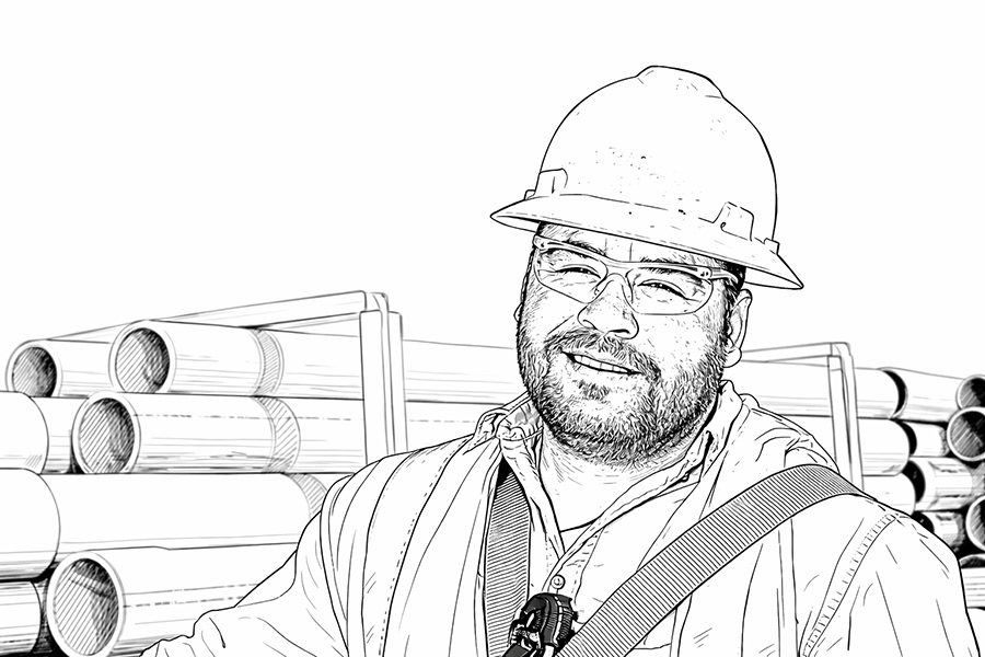 Authentic line art rendered from professional on‑site photography at industrial and construction jobs. Each piece captures the grit, skill, and dignity of real tradespeople — photographed on location, refined in the studio, and delivered as press‑ready prints or digital files.